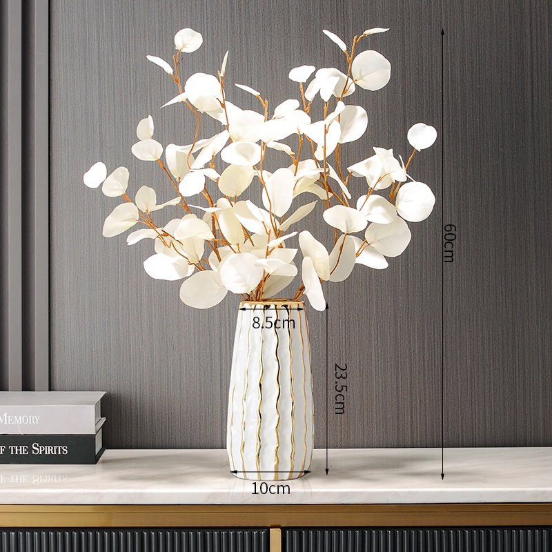 A stylish ceramic vase featuring elegant gold-plated line accents on a smooth matte finish. Perfect for modern or luxury-themed interiors as a centerpiece or floral holder.
